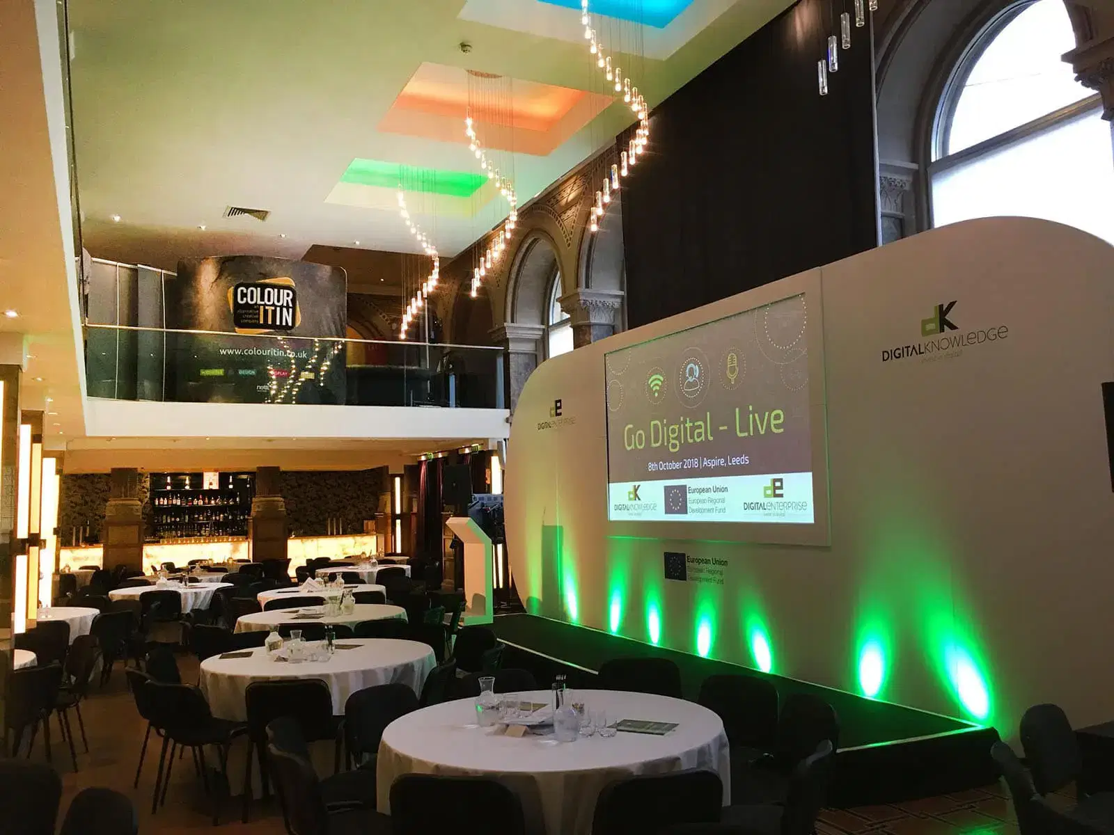 Colour It In recently attended the Go-Live event in Leeds and witnessed at first hand the benefits of having an exhibition stand with an image on both sides. This event in particular was split over an auditorium for the conference and mezzanine exhibition above. At the start of the event we were the only stand that was visible to the delegates during the presentations, but by the end of the day other exhibitors were having to turn their roller banners around to get noticed – which meant their stand looked blank in the exhibition space!